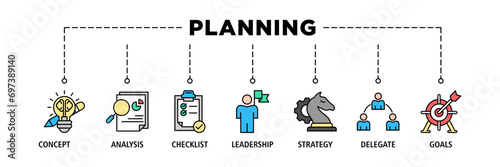 Planning banner web icon set vector illustration concept with icon of concept, analysis, checklist, leadership, strategy, delegate and goals