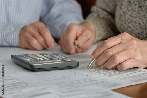 Planning for retirement can be complex process, as seen in this image of senior couple reviewing financial documents together, using calculator to manage their finances