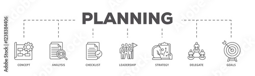 Planning infographic icons flow process which consists of concept, analysis, checklist, leadership, strategy, delegate and goals icon live stroke and easy to edit .