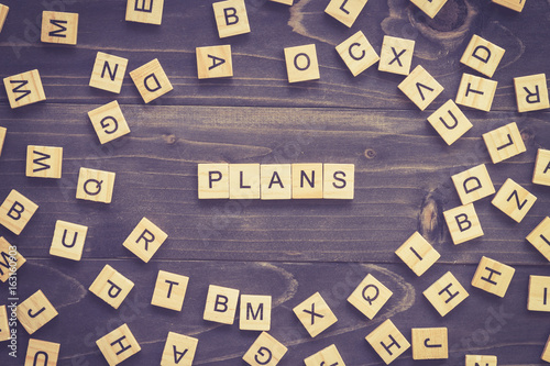 Plans word wood block on table for business concept.