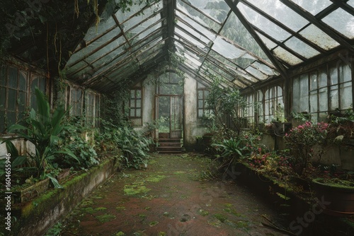 Plants grow inside of vintage greenhouse; moss, forest mountains background; garden decor