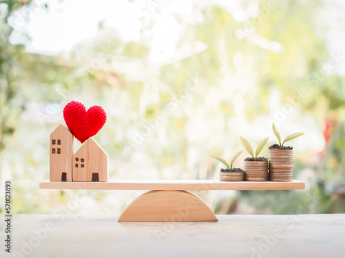 Plants growing up on stack of coins and miniature house on balancing scale for mortgage investment , property concept