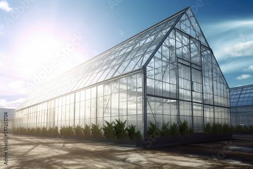 Plants in greenhouse. Growing organic products in modern greenhouse. Created with Generative AI