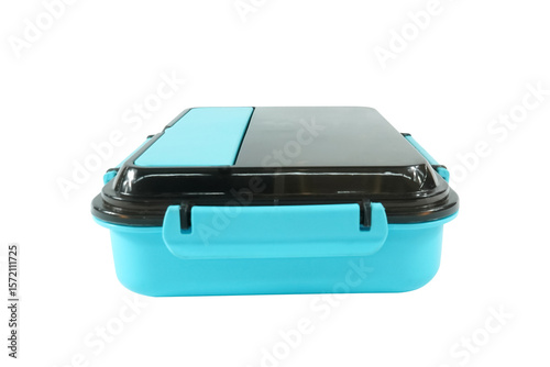 Plastic and stainless lunch box, which is black and blue in color. n white background, food container for school