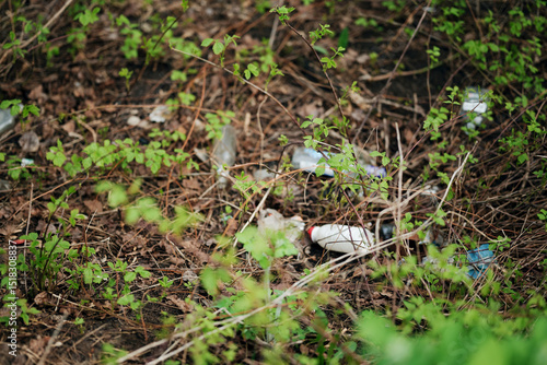 Plastic bottles and garbage scattered among dry branches and spring plants in the forest. Symbol of environmental pollution, ecological problems and human impact on nature.