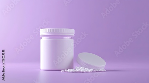plastic jar for medicines on the table and white dragees and a lid lying next to each other. A white open jar on a purple-blue surface. Copy space.