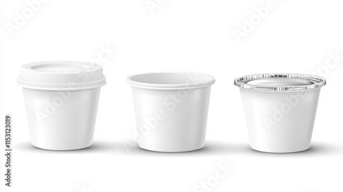 Plastic yogurt cup mockup. Realistic vector illustration set of white closed and open package for cream products. Template of blank round container with foil cap for dairy dessert or cheese.
