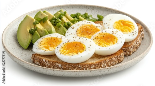 Plate of food featuring eggs avocado slices and black beans arranged on a rustic wooden table
