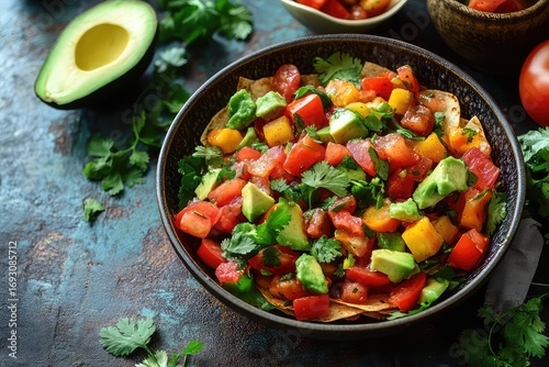 Plate of vegetable quesadillas with salsa, on a rustic table with avocado and cilantro scattered around