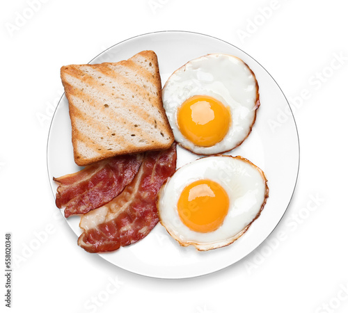Plate with delicious fried eggs, bacon and toast isolated on white, top view