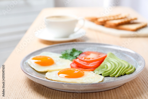 Plate with fried eggs and vegetables on wooden table. Healthy breakfast