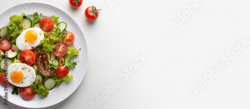 Plated on the table is a fresh breakfast salad featuring vegetable omelet and fried eggs with tomato and cucumber, offering a delightful meal with a blank space image for text or design.