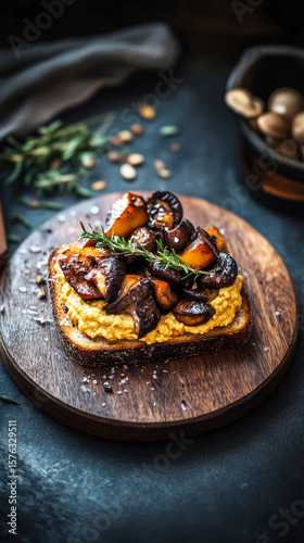 Plates showcase a delightful arrangement of grilled vegetables on dark rye toast topped with herbs. Charred fruit adds color, enhancing the rustic dining experience