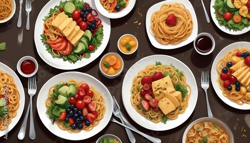Platos de Comida Elegantes Una composición con platos bien decorados de diferentes tipos de comida (ensaladas, pastas, postres) sobre una mesa elegante. Ideal para fondos gastronómicos