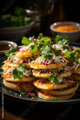 Platter of sopes, small corn cakes topped with savory ingredients, Generative AI