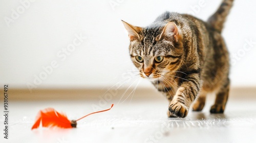 Playful and Curious Domestic Cat Stalking and Pouncing on a Toy Indoors with a White Background Showcasing Its Predatory Nature and Agility