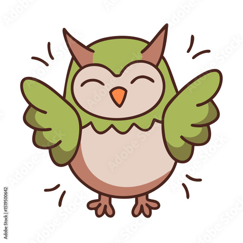 Playful cartoon owl with green wings and a cheerful expression in a whimsical style