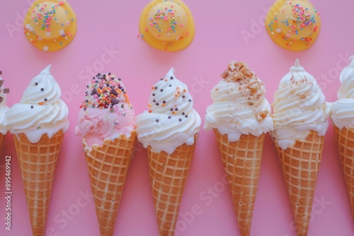 Playful Close-Up of Vanilla Ice Cream Cones with Sprinkles, Nuts, and Chocolate Chips in a Vibrant Pattern on a Sunny Day