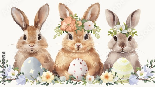 Playful Easter bunnies with floral crowns and pastel eggs, vector illustration on a white background