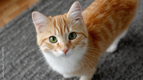 Playful Ginger Cat with Green Eyes Looking Up Against Gray Carpet