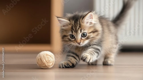 Playful kitten approaching a yarn ball on a wooden floor, soft focus background.