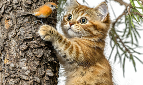 Playful kitten reaching for a small bird perched on a tree trunk, surrounded by greenery in the background