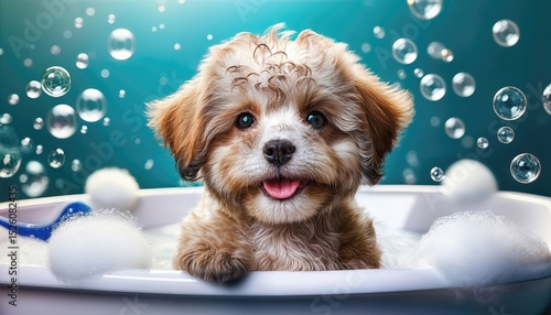 Playful Maltipoo Puppy Bathed in Bubbly Bliss A Joyous Scene of Warmth and Exuberance at Twilight