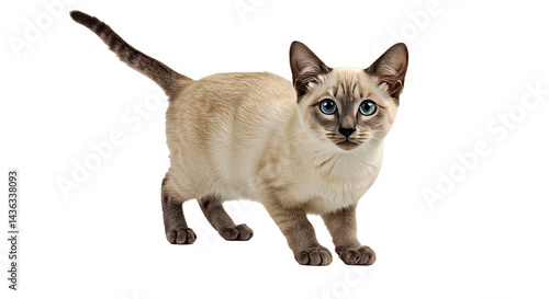 Playful Siamese cat stands with perked ears and a bright, curious gaze, looking alert and engaged. Full body elegant feline isolated on white.