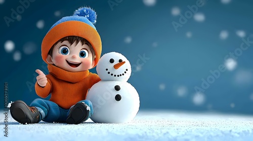 Playful Winter Scene, a cartoon child joyfully crafting a snowman with bright colors and whimsical details in a snowy landscape