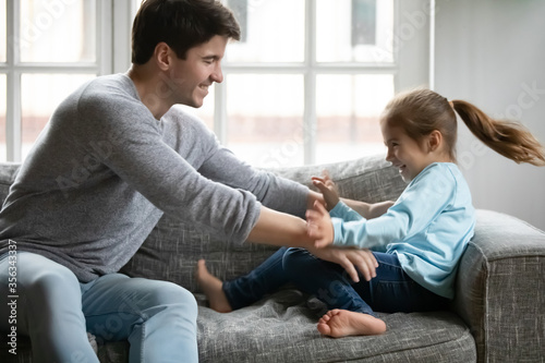 Playful young Caucasian father sit on couch play tickle little preschooler daughter, happy dad have fun engaged in funny game with small girl child, enjoy family weekend at home in living room