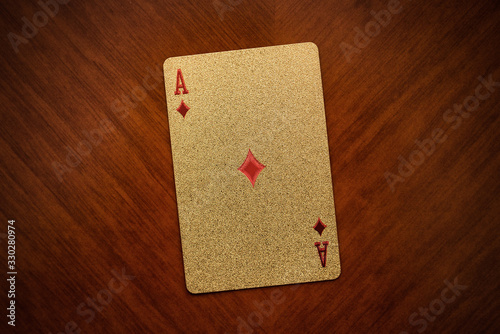 playing ace card on wooden background, ace of diamonds close up, gold, golden ace card of diamonds