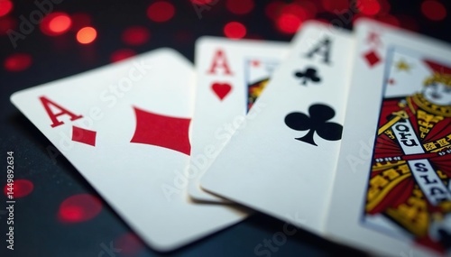 Playing cards arranged in a classic ace sequence , macro, background, retro