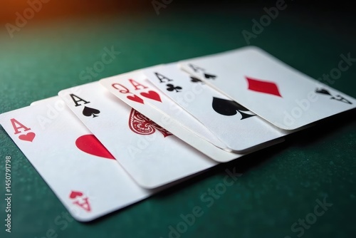 Playing cards arranged in a row showing ace of each suit , diamonds, image, gambling