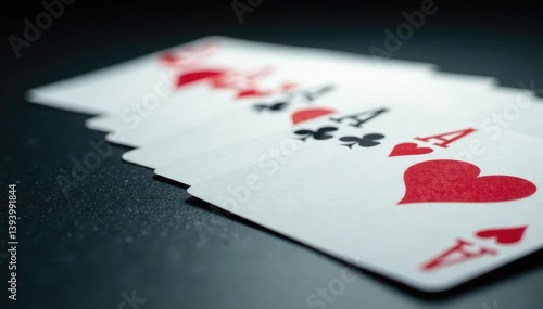 Playing cards arranged in a row, showing ace of each suit , texture, ace