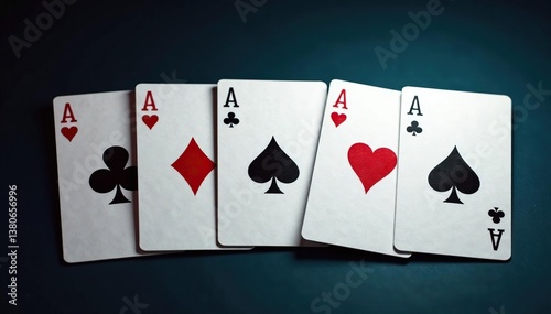 Playing cards arranged in a row showing ace of each suit, hearts, poker