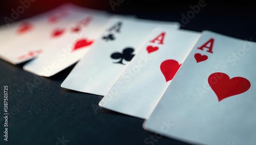 Playing cards arranged in a row showing an ace of each suit , arrangement, spades