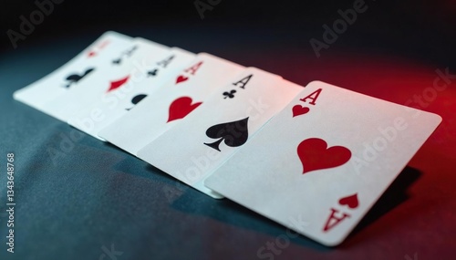 Playing cards arranged in a row showing an ace of each suit , royalty, risk