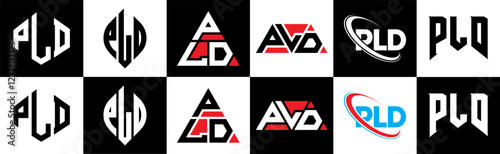 PLD letter logo design in six style. PLD polygon, circle, triangle, hexagon, flat and simple style with black and white color variation letter logo set in one artboard. PLD minimalist and classic logo