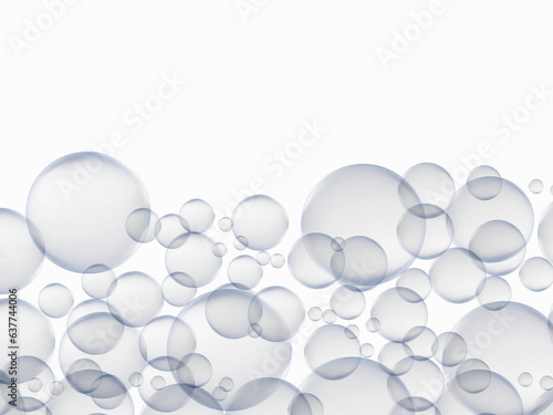 Plenty of bubbles float in the air. Big and small blue water droplets, white background. generative ai
