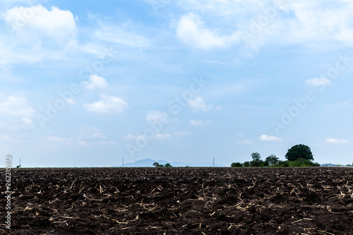 Plowed field in spring time with blue sky. Plowed ground, with brown stones and loose soil . Tractor plowing farm field in preparation for spring planting. Agriculture field ready for sowing seed.