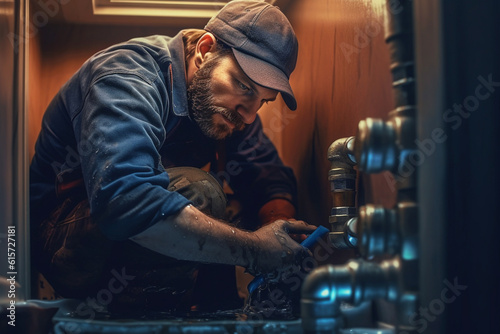 plumber Repairing water pipe in a bright bathroom with Generative AI