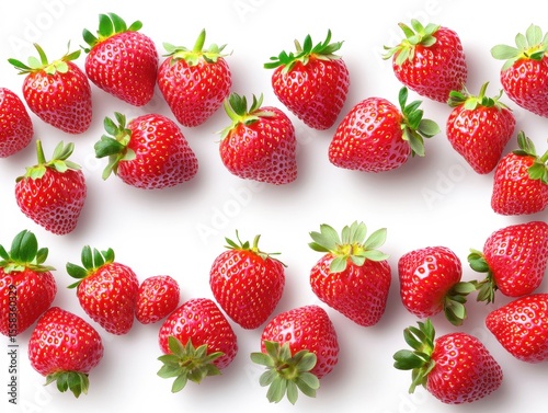 Plump and bright red strawberries are spread out evenly, showcasing their green leafy tops and speckled surfaces, creating an inviting and fresh display perfect for summer recipes.