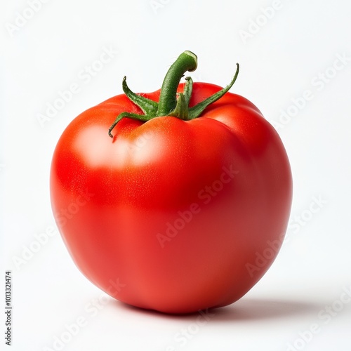 Plump red tomato with a vibrant green stem, isolated on a white background, showing its smooth, glossy surface.