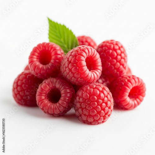plump, ruby-red raspberries, each displaying its intricate drupelets, accompanied by a single fresh green leaf. This delicate duo is meticulously isolated on a pristine white background