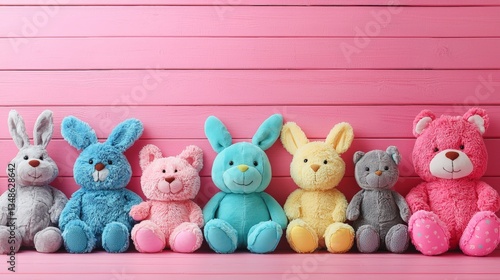 Plush pastel colored Easter bunny toys neatly arranged on a pink wooden shelf creating a charming and nostalgic festive atmosphere