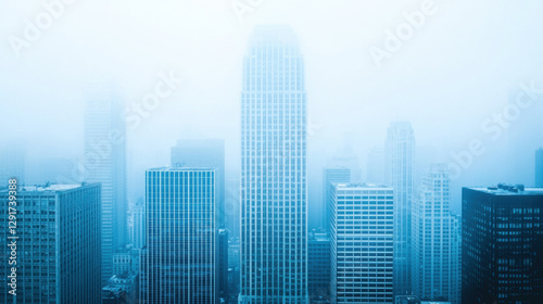 PM 2.5 air pollution health risk. Foggy city skyline with tall buildings and a blue hue.