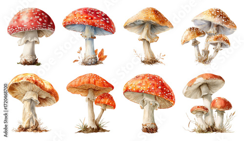 PNG Colorful artistic mushroom illustrations, element set on transparent background