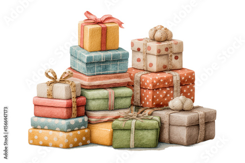 PNG Colorful stack of wrapped gift boxes with patterns and ribbons