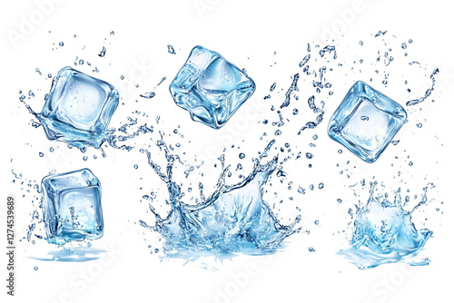 PNG. Floating ice cubes splashing into water with realistic 3D rendering and transparent background effect