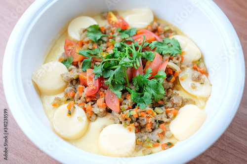 Poached egg garnished with pork, tofu, tomato and vegetable (steamed egg) serve on white bowl set on brown table - homemade food concept.